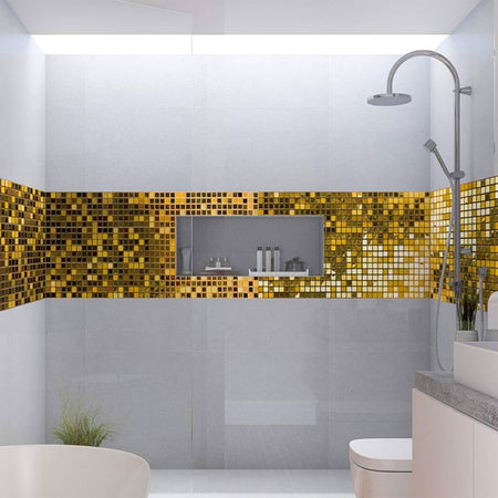 TOP di GAMMA! Piastrella autoadesiva in VETRO lucido mosaico 30x30cm (sp. 3mm) color ORO, idrofobo.