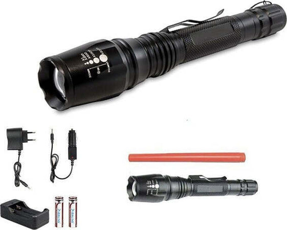 Torcia led tattica ricaricabile e ad alta durabilità, realizzata in alluminio leggero con manico antiscivolo perfetta per l'utilizzo in condizioni di umidità o di pioggia. La torcia è dotata di effetto zoom che permette di allargare o restringere il fascio di luce per avere una luminosità più ampia o più stretta estraendo semplicemente la ghiera. Viene fornita con un particolare bacchetta/tubo catarifrangente per casi di emergenza e sos in modi più visibili anche di notte e sera. Emana un fascio di luce luminossissimo testato fino ad una distanza di 100 metri e può essere utilizzata durante battute di caccia, campeggio, polizia, vigilanza, ecc. Dotata pulsante di accensione situato a fondo torcia.