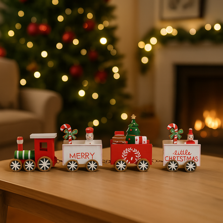Il trenino decorativo in legno, composto da una locomotiva e quattro vagoni collegati da sottili ganci in metallo, incarna la tradizione natalizia in un piccolo oggetto pieno di fascino artigianale.