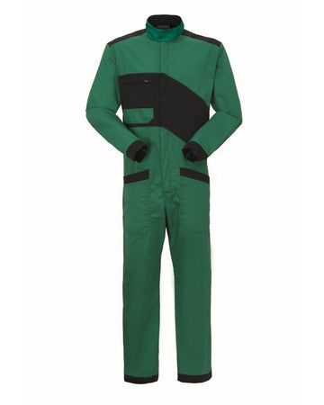 Tuta da lavoro con chiusura con cerniera centrale coperta, collo alla coreana chiuso con velcro. Un taschino applicato al petto destro chiuso con cerniera, due tasche inferiori applicate con profilo di colore a contrasto, elastico posteriore in vita, fondo manica dritto richiudibile con velcro. Profilo di colore a contrasto al fondo gamba e manica, inserto in tessuto di colore a contrasto sul petto e sulle spalle. Gabardine, 65% poliestere, 35% cotone. Peso 245 g/m² I^ Categoria per rischi minimi