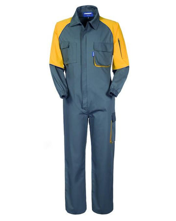 Tuta da lavoro con chiusura con cerniera centrale coperta, profilo blu rifrangente inserito nella cucitura delle maniche a raglan, collo a camicia. Un tascone applicato su gamba sinistra con soffietto laterale di colore giallo chiuso con aletta e velcro, un taschino applicato al petto sinistro con soffietto laterale di colore giallo chiuso con aletta e velcro, un taschino porta cellulare applicato al petto destro con soffietto laterale di colore giallo chiuso con aletta e velcro, una tasca portapenne applicata al petto destro, un taschino applicato alla manica sinistra chiuso con cerniera, elastico invita posteriore, elastico ai polsi. Gabardine, 65% poliestere, 35% cotone. Peso 245 g/m² I^ Categoria per rischi minimi