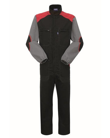 Tuta da lavoro con chiusura con cerniera centrale coperta, collo alla coreana chiuso con velcro. Due taschini applicati al petto chiusi con cerniera, due tasche inferiori applicate con profilo di colore a contrasto, elastico ai polsi. Elastico posteriore in vita e toppe sui gomiti, spalloni in tessuto di colore a contrasto con cuciture a rombi, inserto in rete sotto le ascelle. Gabardine, 65% poliestere, 35% cotone. Peso 245 g/m² I^ Categoria per rischi minimi
