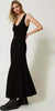 Abito lungo in maglia stretch lavorata in punto rasato, senza maniche, con scollatura a V. Cintura rimovibile in vita regolabile con fibbia a cuore in metallo, placchetta logo in metallo sul retro, linea svasata.