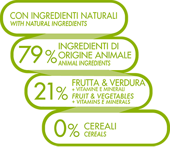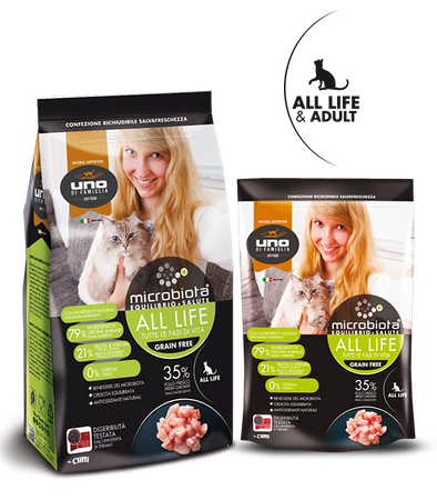 I gatti sono carnivori e hanno bisogno di un’alimentazione adeguata, ricca di ingredienti di origine animale, con limitate quantità di amido e con una adeguata presenza di fibra. Il mangime per gatti UNO DI FAMIGLIA ALL LIFE, che ha il pollo fresco come primo ingrediente ed è senza cereali (grain free), è studiato per soddisfare le esigenze nutrizionali del gatto in tutte le sue fasi di vita, rifacendosi ai carnivori selvatici i quali non cambiano la propria alimentazione in base alla loro età. La sua elevata digeribilità è testata dall’Università di Teramo. Ma c’è di più! UNO DI FAMIGLIA contiene NUTRIMICRO, uno speciale mix di ingredienti studiato per nutrire e salvaguardare il MICROBIOTA intestinale, grazie alla presenza di PREBIOTICI (Inulina), POST-BIOTICI (Tributirrato) ed altre sostanze attive sul microbiota (MOS, Bioflavonoidi) che ne favoriscono l’equilibrio, contrastandone le alterazioni (disbiosi). UNO DI FAMIGLIA senza coloranti e conservanti aggiunti, è quindi la dieta, biologicamente appropriata e bilanciata secondo natura che è anche in grado di nutrire il Microbiota, favorendo il benessere dell’intestino.