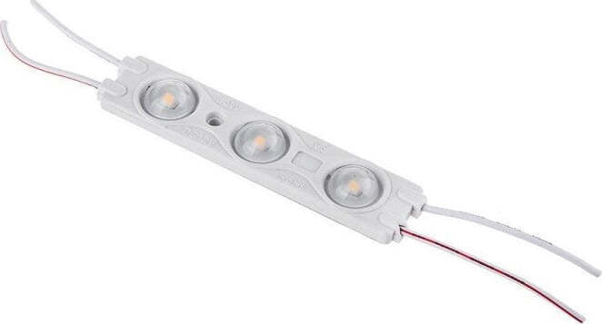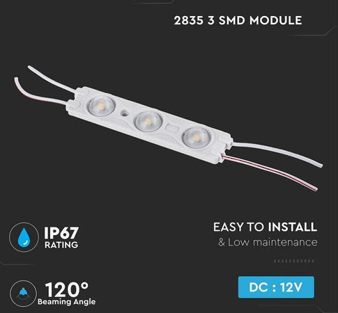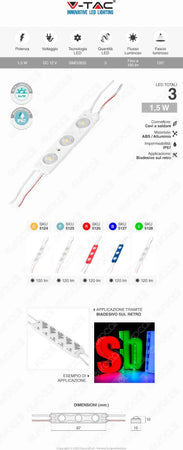 V-Tac VT-28356 modulo monocolore composto da 3 LED SMD 2835 con potenza totale di 1,5W e flusso luminoso complessivo fino a 150 lm. Ad alta luminosità e realizzato in ABS e alluminio, ha un fascio luminoso di 120° ed un rapporto fino a 100 lm/W. Grazie al suo grado di protezione IP67 è idoneo sia ad un uso domestico che industriale, ed è impiegabile anche nell'illuminazione architettonica di interni ed esterni. Date le ridotte dimensioni, è inoltre possibile utilizzarlo per insegne pubblicitarie o di segnalazione di qualsiasi misura e spessore. Il fascio luminoso diffuso consente una distribuzione omogenea della luce, mentre il biadesivo applicato sul retro rende il modulo di facile installazione. Il collegamento tramite cavi a saldare permette di alimentare tutti i moduli da un'unica fonte. Per il funzionamento è necessario un alimentatore 12V a corrente diretta proporzionato all'assorbimento totale di potenza di tutti i moduli collegati.