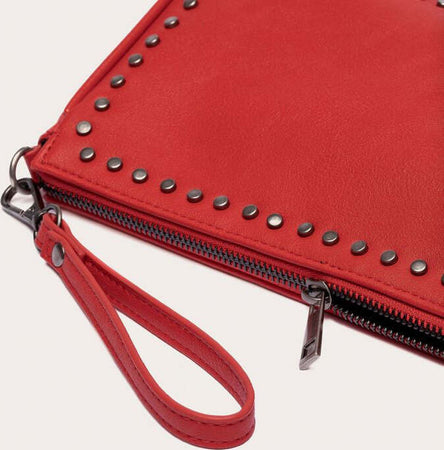 Borsa London rossa. Materiale corpo e manico: 100% poliuretano. Fodera: 100% poliestere. Tasca interna con 1 zip e 2 tasche aperte. Chiusura con cerniera. Misure: 26 x 15 x 6 cm. Manico: tracolla regolabile e manico polso rimovibili. Inserti borchie. Morbido modello baguette perfetto per i tuoi look giorno e sera.