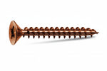 tutta filettata, vite universale adatta per l?avvitamento senza preforo su pannelli truciolari, legni naturali scuri, elementi di ferramenta bronzata, trattamento galvanico di bronzatura, riporto elettrolitico di rame (spessore 6 micron) con ossidazione chimica bronzante ed oliatura protettiva, trattamento di lubrificazione "LUBEX" per ridurre l?attrito fino al 50%, testa con impronta a croce Pozidrive