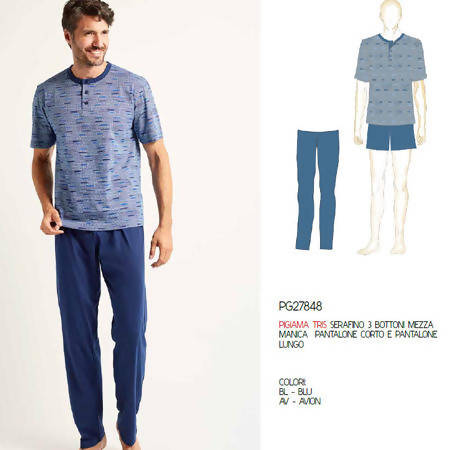 Pigiama 3 Pz Uomo Nottingham Classic Pigiama Avion Blu in Cotone Jersey Pigiama Uomo Tris T-Shirt Maniche Corte Pantaloncino Corto E Pantalone Lungo Art. Pg27848-Av