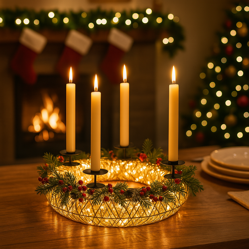 Corona con 4 portacandele con luci Led color oro per decorazione natalizia