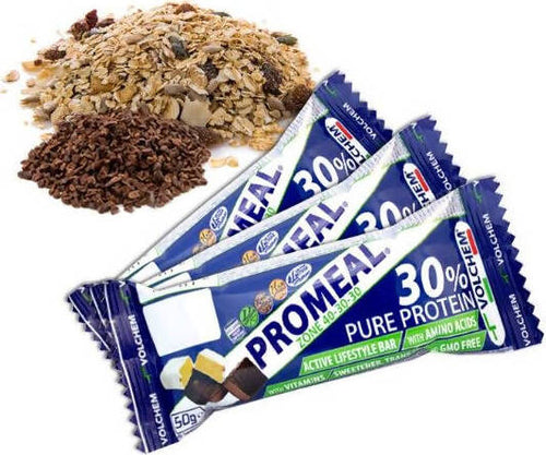 Promeal 30% proteine cereali e cacao barrette proteiche 50 gr Volchem, confezione da 24 pezzi