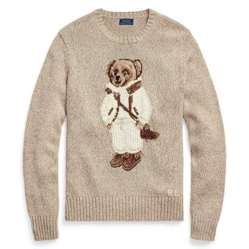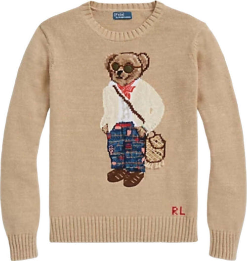 Polo Ralph Lauren Maglione Donna Polo Bear Foulard Girocollo Beige Misto Cotone Orsetto Ricamato